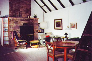 Kamin und Esstisch. Über die Treppe ganz rechts im Bild gelangt
